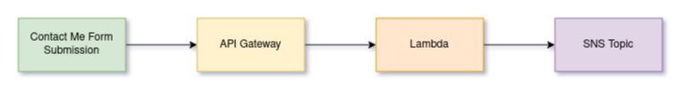 I decided to take advantage of some AWS serverless offerings to build my form submission service. Below is a high-level overview of how I will utilize each. The Contact-me form submission originates from the client, but is provided by resources hosted on an S3 bucket.