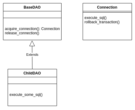 This means that our ChildDAO would have a method execute_some_sql() that can acquire a connection object, and that the
